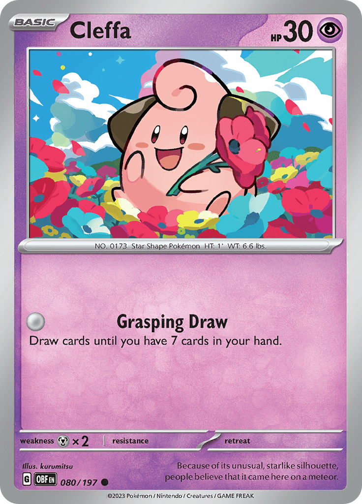 Illustration Rare Cleffa. Cleffa makes a comeback in Pokemon TCG with this cute card depicting the star-shaped Pokemon in an aesthetic scenery.