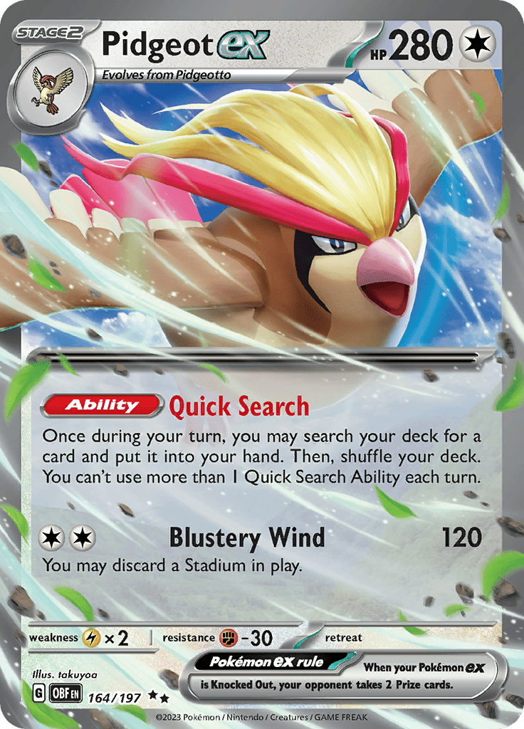 Double Rare Pidgeot ex. Another staple for Charizard ex decks, this Gen 1 bird has a powerful ability that works like a supporter card, allowing you to fetch any card you need from your deck to your hand.