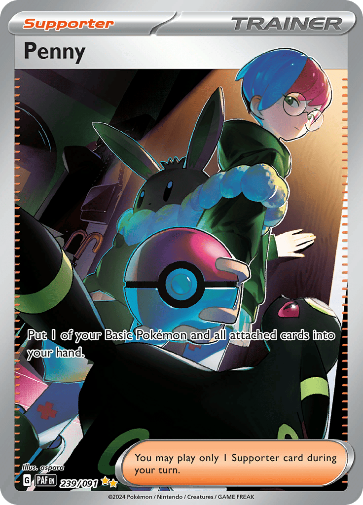 Cute full-art cards. Check out the full art cards in this set and you’ll get what we mean. From the chibi-style characters in the Clive card, to the group of Pawmi sleeping together, getting a full art alone is a blessing when opening a Paldean Fates booster pack.