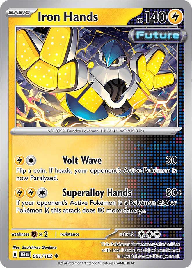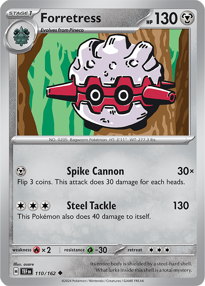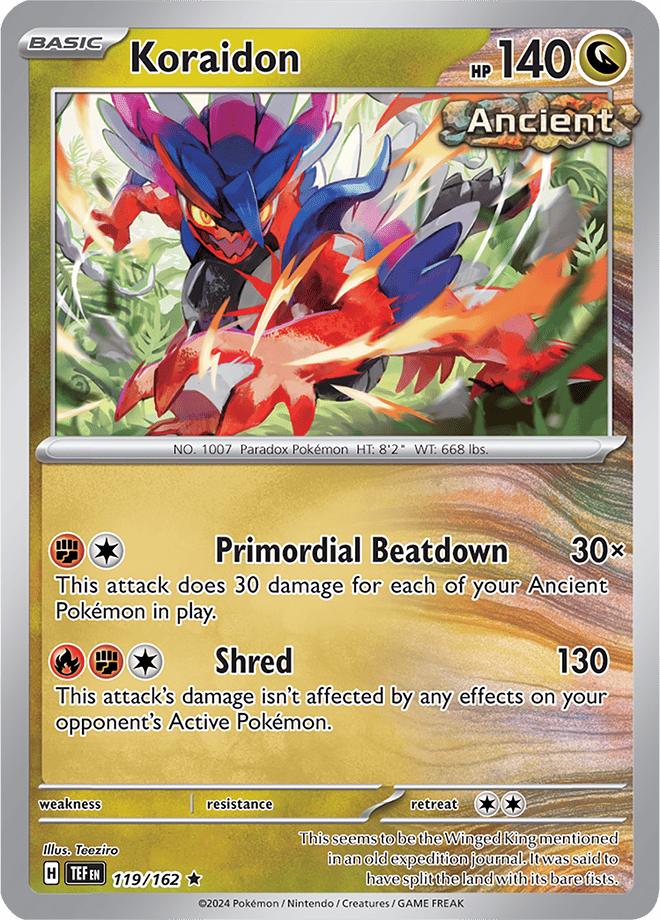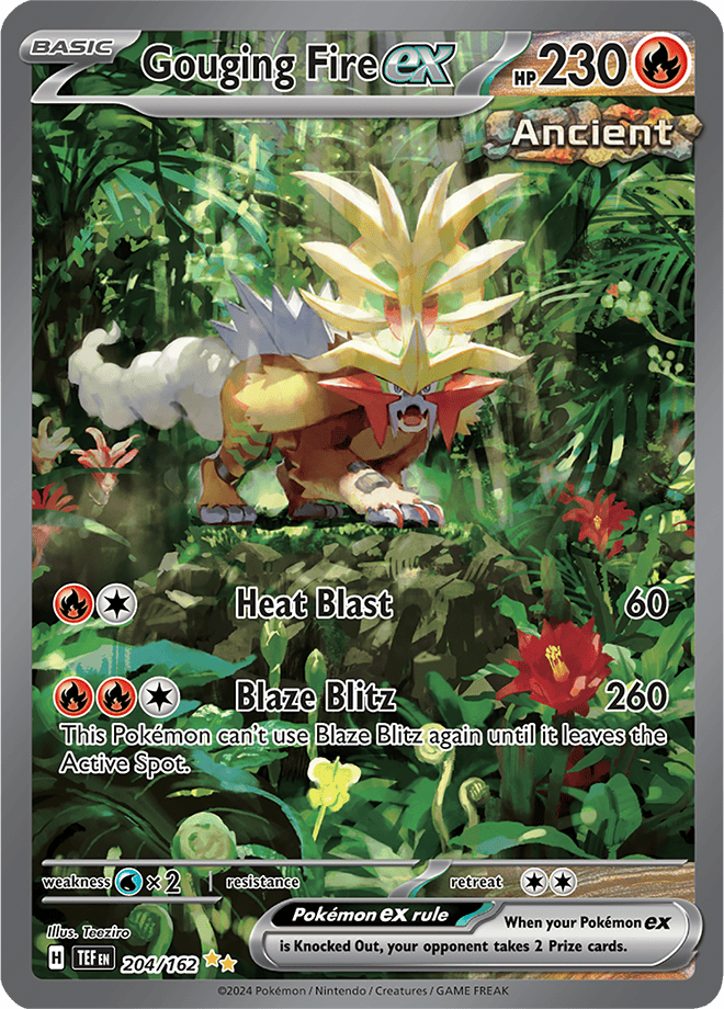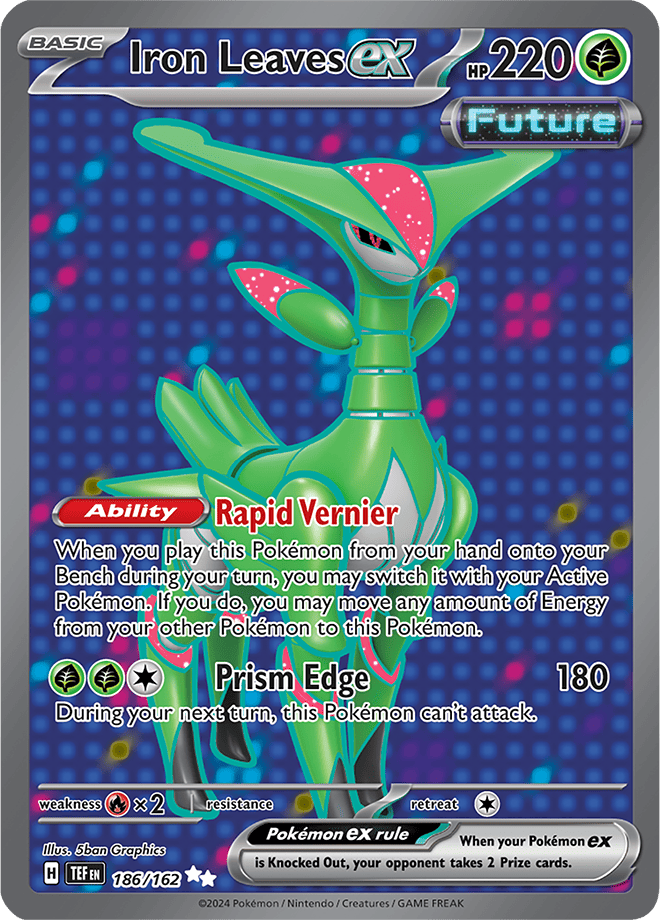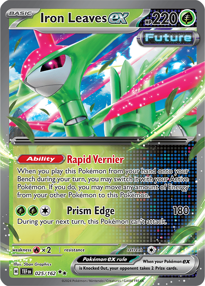 Pokemon Scarlet & Violet – Temporal Forces Card List Grass #1 Scyther #2 Pineco #3 Seedot #4 Nuzleaf #5 Shiftry #6 Shroomish #7 Breloom #8 Roselia #9 Roserade #10 Turtwig #11 Grotle #12 Torterra Ex #13 Shaymin #14 Cottonee #15 Whimsicott #16 Deerling #17 Sawsbuck #18 Grubbin #19 Dhelmise #20 Bramblin #21 Brambleghast #22 Scovillain Ex #23 Rellor #24 Rabsca #25 Iron Leaves Ex Fire #26 Ponyta #27 Rapidash #28 Slugma #29 Magcargo #30 Victini #31 Heatmor #32 Litten #33 Torracat #34 Incineroar Ex #35 Turtonator #36 Sizzlipede #37 Centiskorch #38 Gouging Fire Ex Water #39 Totodile #40 Croconaw #41 Feraligatr #42 Carvanha #43 Sharpedo #44 Keldeo #45 Snom #46 Frosmoth #47 Wiglett #48 Finizen #49 Palafin #50 Walking Wake Ex Lightning #51 Pikachu #52 Raichu #53 Electabuzz #54 Electivire #55 Charjabug #56 Vikavolt #57 Zeraora #58 Yamper #59 Boltund #60 Wugtrio #61 Iron Hands #62 Iron Thorns Psychic #63 Mr. Mine #64 Marill #65 Azumarill #66 Girafarig #67 Latias #68 Bronzor #69 Bronzong #70 Solosis #71 Duosion #72 – Reuniclus #73 Elgyem #74 Beheeyem #75 Cutiefly #76 Ribombee #77 Scream Tail #78 Flutter Man #79 Iron Valiant #80 Iron Valiant #81 Iron Crown Ex Fighting #82 Meditite #83 Medicham #84 Relicanth #85 Drilbur #86 Excadrill #87 Golette #88 Golurk #89 Rockruff #90 Lycanroc #91 Mudbray #92 Mudsdale #93 Rolycoly #94 Carkol #95 Coalossal #96 – Great Tusk #97 Great Tusk #98 Sandy Shocks #99 Iron Boulder Ex Darkness #100 Ekans #101 Arbok #102 Gastly #103 Haunter #104 Gengar Ex #105 Poochyena #106 Mightyena #107 Sableye #108 Farigiraf #109 Roaring Moon Metal #110 Forretress #111 Scizor Ex #112 Mawile #113 Beldum #114 Metang #115 Metagross #116 Meltan #117 Melmetal #118 Iron Treads Dragon #119 Koraidon #120 Koraidon Ex #121 Miraidon #122 Miraidon Ex #123 Raging Bolt Ex Colorless #124 Lickitung #125 Lickilicky #126 Hoothoot #127 Noctowl #128 Dunsparce #129 Dudunsparce #130 Skitty #131 Delcatty #132 Chato #133 Pidove #134 Tranquil #135 Unfezant #136 Minccino #137 Cinccino #138 Drampa 139 Iron Jugulis Trainers #140 Ancient Booster Energy Capsule #141 Awakening Drum #142 Bianca’S Devotion #143 Boxed Order #144 Buddy-Buddy Poffin #145 Ciphermaniac’S Codebreaking #146 Eri #147 Explorer’S Guidance #148 Full Metal Lab #149 Future Booster Energy Capsule #150 Hand Trimmer #151 Heavy Baton #152 Hero’S Cape #153 Master Ball #154 Maximum Belt #155 Mortys Conviction #156 Perilous Jungle #157 Prime Catcher #158 Reboot Pod #159 Rescue Board #160 Salvatore Special Energy #161 Mist Energy #162 Neo Upper Energy Illustration Rare Pokemon #163 Shiftry #164 Grotle #165 Deerling #166 Sawsbuck #167 Litten #168 Snom #169 Charjabug #170 Bronzor #171 Reuniclus #172 Cutiefly 173 Relicanth #174 Excadrill #175 Mudsdale #176 Arbok #177 Gastly #178 Metagross #179 Meltan #180 Lickitung #181 Chatot #182 Minccino #183 Cinccino #184 Drampa Full Art Pokemon #185 Torterra Ex #186 Iron Leaves Ex Full Art Supporters #197 Biancas Devotion #198 Ciphermaniacs Codebreaking #199 Eri #200 Explorers Guidance #201 Mortys Conviction #202 Salvatore Special Illustration Rare Pokemon #203 Iron Leaves Ex #204 Gouging Fire Ex #205 Walking Wake Ex #206 Iron Crown Ex #207 Iron Boulder Ex #208 Raging Bolt Ex Special Illustration Rare Pokemon #209 Biancas Devotion #210 Eri #211 Mortys Conviction #212 Salvatore Hyper Rare Cards #213 Iron Leaves Ex #214 Gouging Fire Ex #215 Walking Wake Ex #216 Iron Crown Ex #217 Iron Boulder Ex #218 Raging Bolt Ex Cards Cut For Promos #185 Torterra Ex #186 Iron Leaves Ex